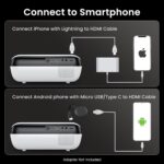 • [ Compatibility Notice ] – This mini projector works with smartphones and tablets, but requires an HDMI adapter (not included). For iOS, use an official Lightning to HDMI adapter. For Android, if your phone supports MHL, use a Micro USB/Type-C to HDMI cable (not included); otherwise, a Chromecast is recommended for wireless mirroring. Enjoy a seamless big-screen experience with this versatile phone projector!